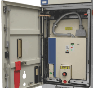 Fully segregated by earthed metal partitions and having its own pressure relief channel, the VCB compartment houses the bushing insulators containing fixed contacts for the connection of the circuit breaker to the busbars and the cable compartment. The bushings are covered by automatic metallic shutters. All safety interlocking mechanisms required for safe and reliable operations of the VCB, an emergency trip push-button, two inspection windows for mechanical position indication: one for VCB and the other for draw-out unit mechanisms; are fitted into the compartment. The VCB is mechanically and electrically interlocked with the compartment door so that the door cannot be opened until the VCB is turned off and racked out to the test position. For extra safety, the tool orifice to the racking in/out mechanism is equipped with a shutter operated by a keylock.