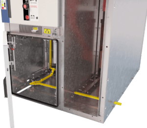The gas exhaust duct accommodates all three pressure relief flaps and is mounted on the top of each panel. It runs along the whole length of the switchboard. The pressure generated by the internal arc makes a pressure relief flap open thus allowing hot gases to run into a special chimney to be evacuated to dedicated areas.